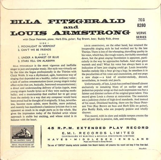 Ella Fitzgerald & Louis Armstrong - Moonlight In Vermont / Can't We Be Friends / Under A Blanket Of Blue / Stars Fell On Alabama - UK 7" 1957 - VG+