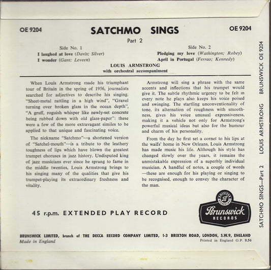 Louis Armstrong With Orchestra* - Satchmo Sings - Part 2 - UK 7" 1956 - VG+