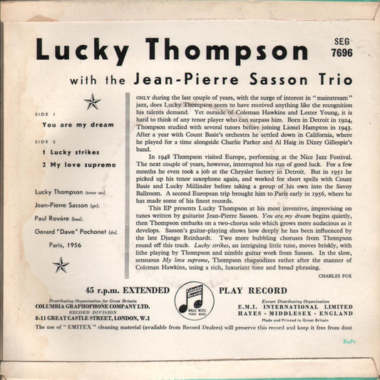 Lucky Thompson With The Jean-Pierre Sasson Trio - You Are My Dream - UK 7" 0 - VG+