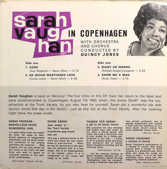 Sarah Vaughan - Sarah Vaughan In Copenhagen - Denmark 7" 1963 - VG+