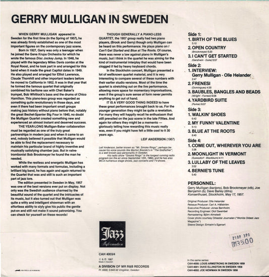Gerry Mulligan - In Sweden - Sweden 2xLP 1987 - VG+
