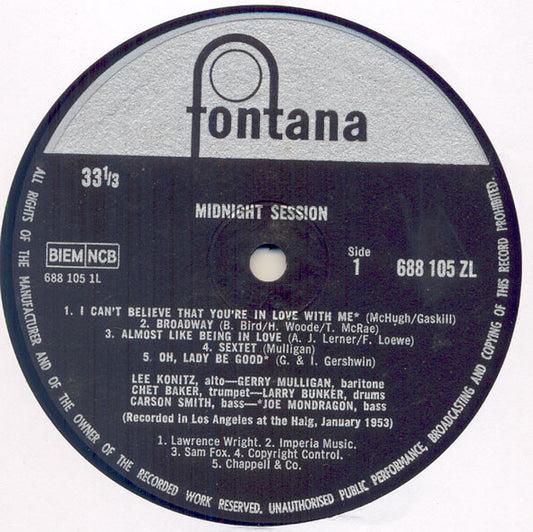 Gerry Mulligan Featuring Lee Konitz & Chet Baker - Midnight Session (LP, Album, Mono) UK 1963 VG+