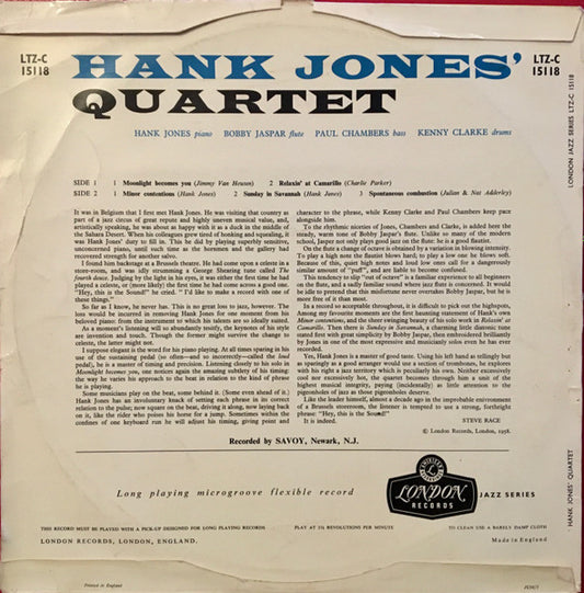 Hank Jones Trio Plus The Flute Of Bobby Jaspar - Hank Jones' Quartet - UK LP 1956 - VG+