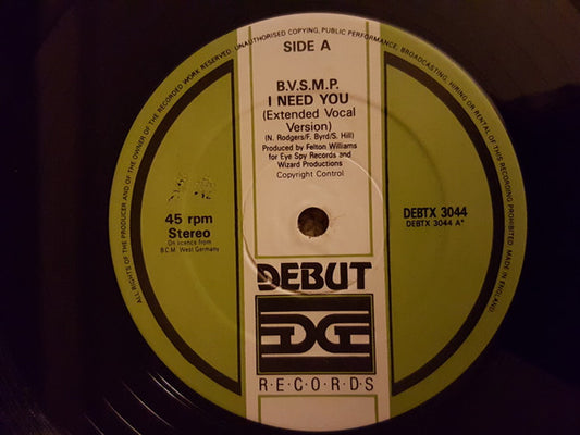 B.V.S.M.P. - I Need You (12") UK 1988 VG+