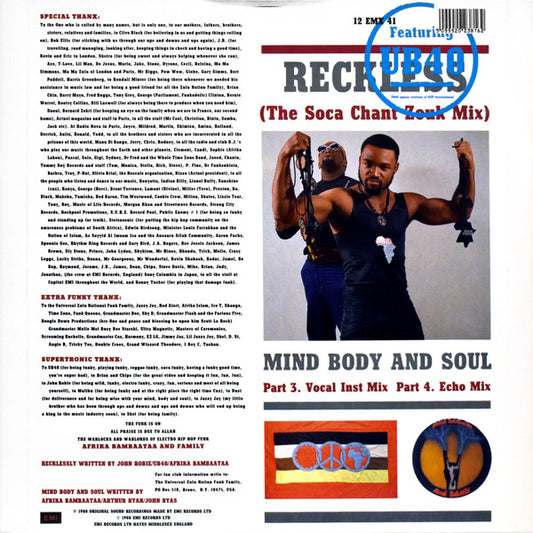 Afrika Bambaataa & Family Featuring UB40 - Reckless (The Soka Chant Zouk Mix) (12") UK 1988 VG+