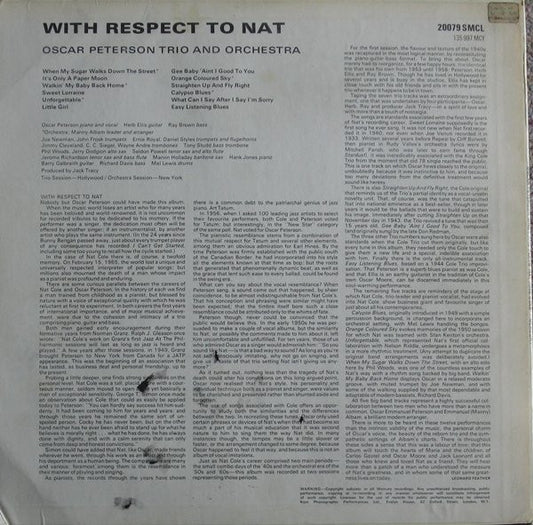 The Oscar Peterson Trio & Oscar Peterson and His Orchestra - With Respect To Nat - Oscar Peterson Sings And Plays Nat King Cole (LP) UK 1965 NM or M-