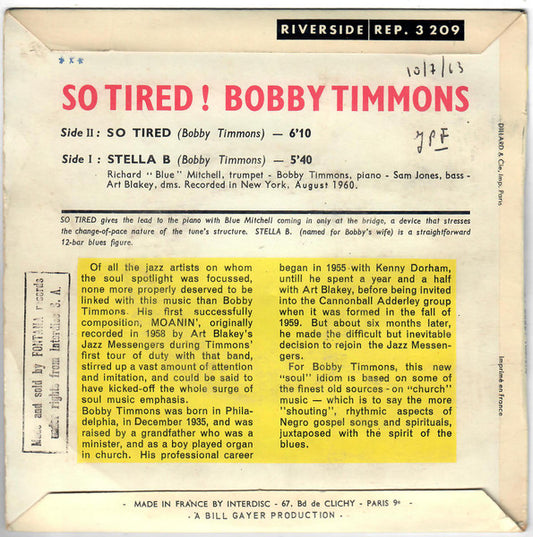 Bobby Timmons - So Tired - France 7" 1963 - VG+