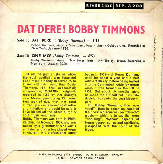 Bobby Timmons - Dat Dere - France 7" 1963 - VG+