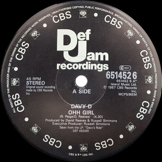 Davy D - Ohh Girl (12") UK 1987 VG+