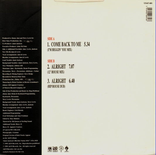 Janet Jackson - Come Back To Me / Alright (12", Single) UK 1990 VG+