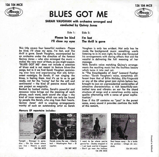 Sarah Vaughan - Blues Got Me - Netherlands 7" 0 - VG+
