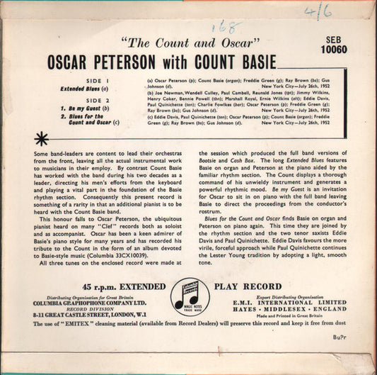 Oscar Peterson With Count Basie - The Count And Oscar - UK 7" 1957 - VG+