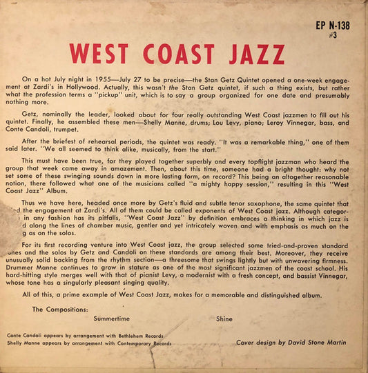 Stan Getz, Shelly Manne, Leroy Vinnegar, Conte Candoli, Lou Levy - West Coast Jazz #3 - US 7" 1955 - VG+