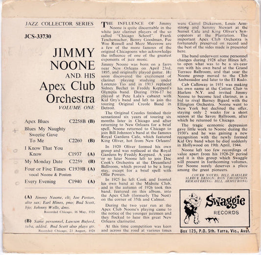 Jimmie Noone's Apex Club Orchestra - Jimmy Noone And His Apex Club Orchestra Vol. One - Australia 7" 0 - VG+