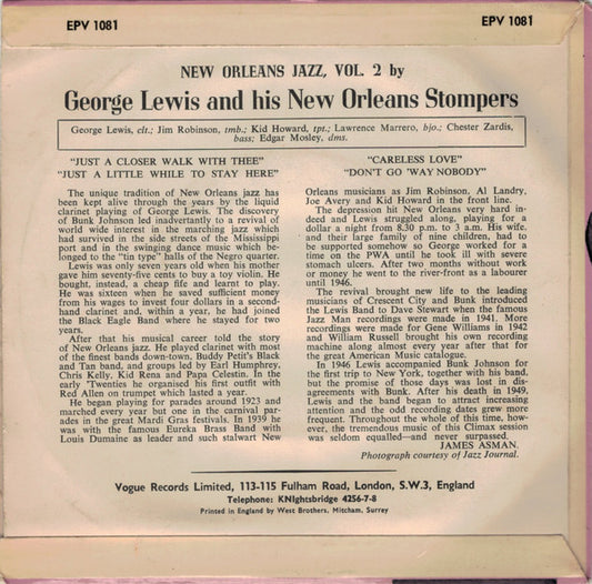 George Lewis And His New Orleans Stompers - New Orleans Jazz, Vol. 2 - UK 7" 1955 - VG+