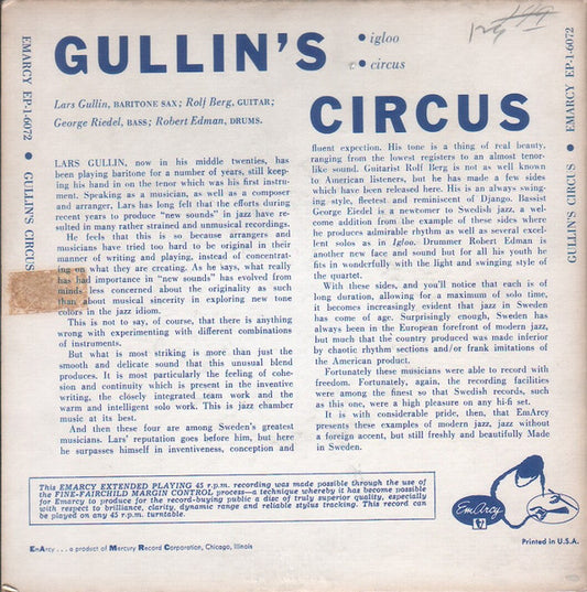 Lars Gullin Quartet - Gullin's Circus - US 7" 0 - VG+Regular price £5.00 GBPRegular priceUnit price / per-