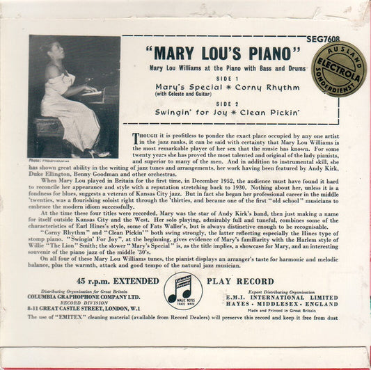 Mary Lou Williams - Mary Lou's Piano - UK 7" 1955 - VG+Regular price £5.00 GBPRegular priceUnit price / per-