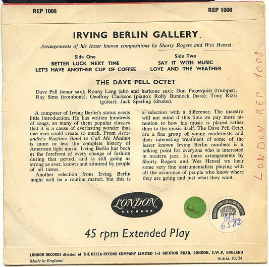 Dave Pell Octet - Irving Berlin Gallery - UK 7" 1954 - VG+Regular price £5.00 GBPRegular priceUnit price / per-