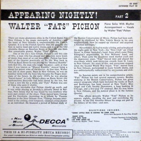 Walter "Fats" Pichon - Appearing Nightly! At The Old Absinthe House Part 2 - US 7" 0 - VG+Regular price £5.00 GBPRegular priceUnit price / per-