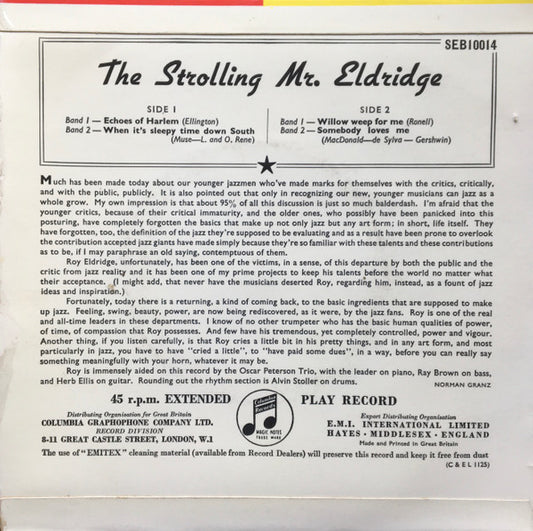 Roy Eldridge, The Oscar Peterson Trio - The Strolling Mr. Eldridge - UK 7" 1955 - VG+Regular price £5.00 GBPRegular priceUnit price / per-