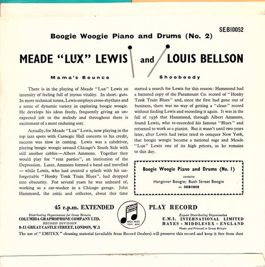 Meade "Lux" Lewis And Louis Bellson - Boogie Woogie Piano And Drums (No. 2) - UK 7" 1956 - VG+Regular price £5.00 GBPRegular priceUnit price / per-