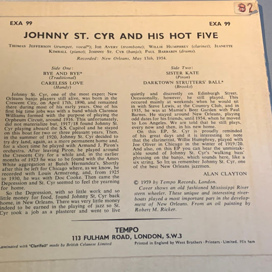 Johnny St. Cyr And His Hot Five - Jazz From New Orleans - UK 7" 0 - VG+