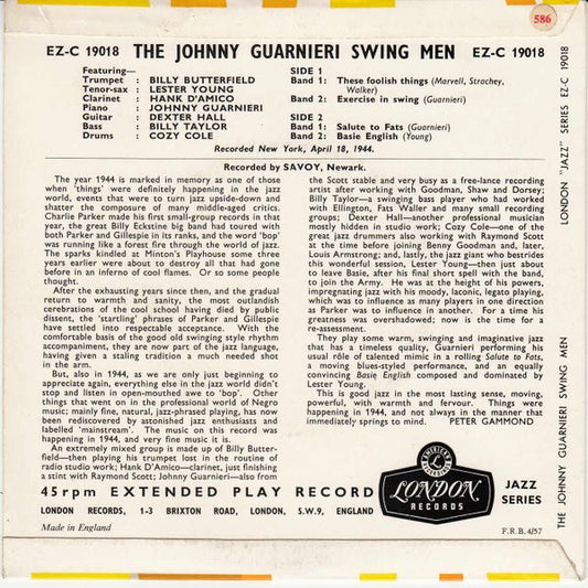 Johnny Guarnieri Swing Men Featuring Lester Young - Untitled - UK 7" 1957 - VG+