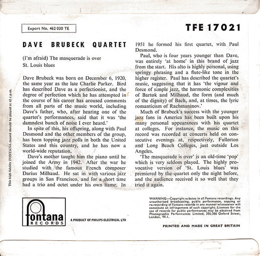 The Dave Brubeck Quartet - (I'm Afraid) The Masquerade Is Over / St. Louis Blues - UK 7" 1957 - VG+