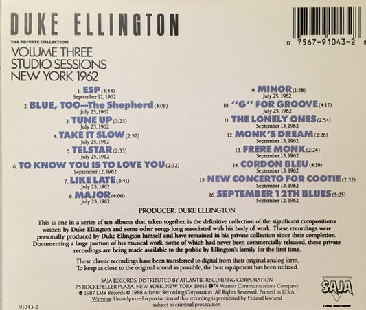 Duke Ellington - The Private Collection: Volume Three, Studio Sessions, New York 1962 - US CD 1988 - VG+