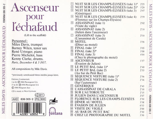 Miles Davis - Ascenseur Pour L'Échafaud (Lift To The Scaffold) (CD, Album, RE) Europe 0 VG+