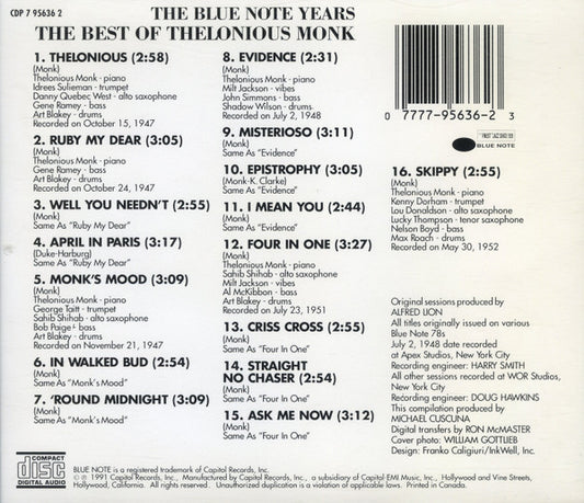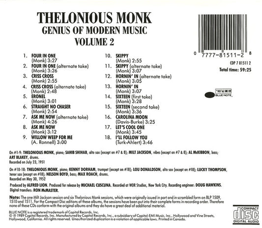 Thelonious Monk - Genius Of Modern Music Volume 2 (CD, Comp, RE) US 1989 VG+