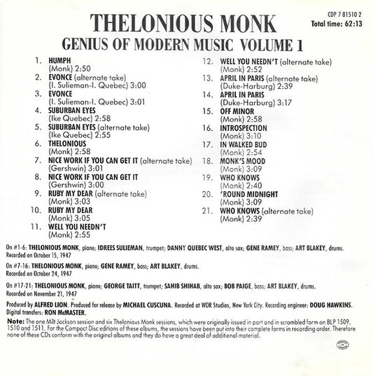 Thelonious Monk - Genius Of Modern Music Volume 1 - USA & Canada CD 0 - VG+