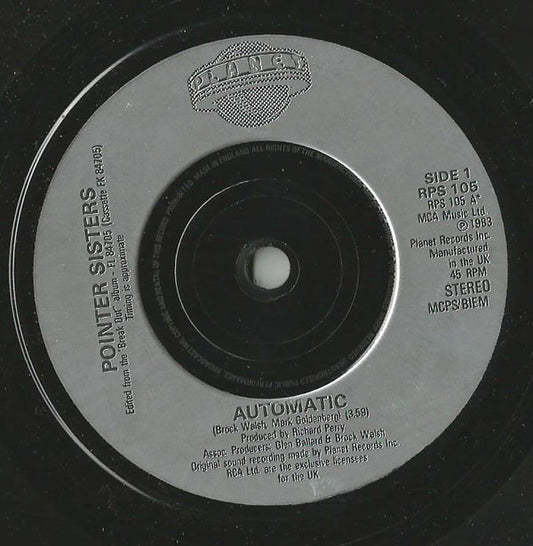 Pointer Sisters - Automatic (7", Single, Inj) UK 1984 NM or M-