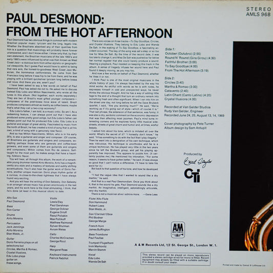 Paul Desmond - From The Hot Afternoon - UK LP 1970 - VG+